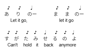 ディズニー映画『アナと雪の女王』の「Let It Go」だ。英語版はメロディに言葉がスムーズに乗るが、日本語版「ありのままで」では工夫しながら意訳して言葉を乗せている。