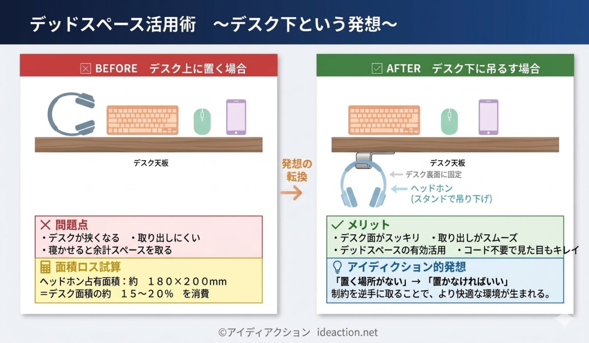 設置後、デスクの上からヘッドホンが消えた。手を伸ばせばすぐ取れる場所にあるのに、視界には入らない。