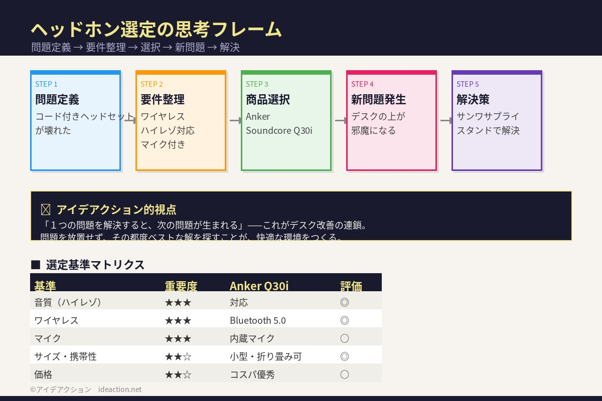 ヘッドホンが壊れた日、デスクが劇的に変わった話——Anker Soundcore Q30i + ヘッドホンスタンドで叶えた作業スペースのカイゼン